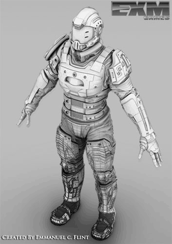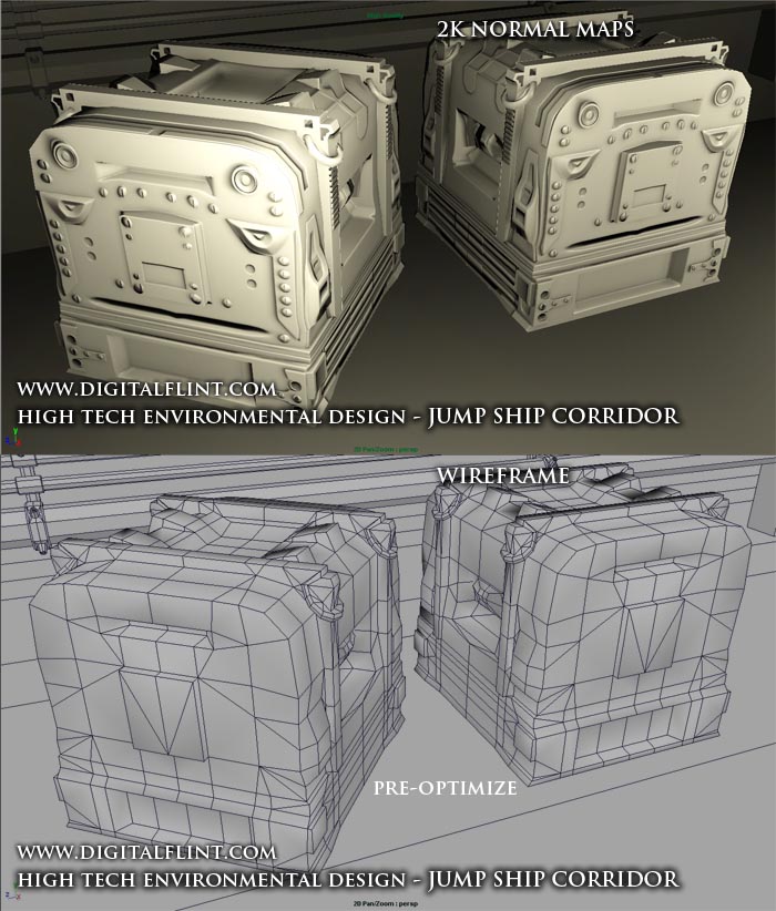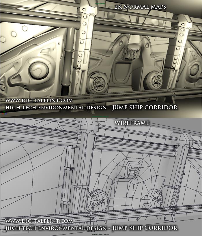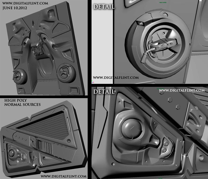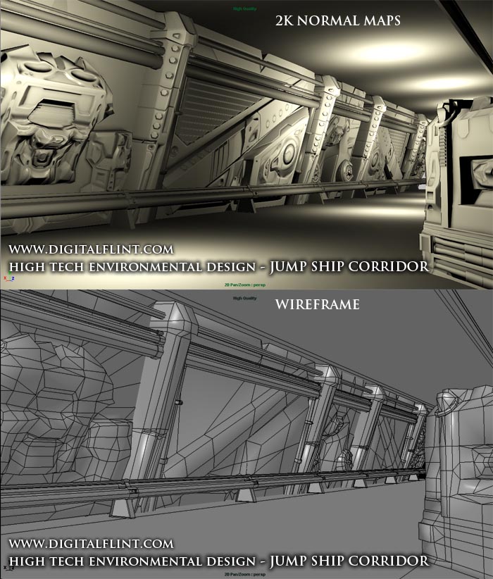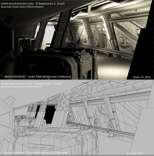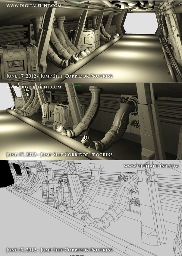 Check out the latest progress on the jump ship corridor. You will find that I did some serious upgrading in comparison with the original reference material in the final demo video from the jump ship hangar project in the "Work in Progress" section. Click on the image above for a high res screen shot. This project is at about twenty hour thus far. This includes that time needed to bake the normals from the high-res geometry. Sign Off. 9:27am. E.Flint June 15, 2012